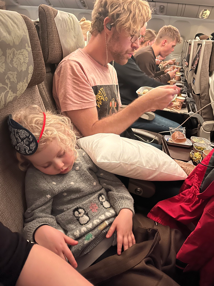 På flyget hit sov jag mest. Gick bra med pappas öronproppar och mammas ögonbindel. Frukosten var god. Jag sov visst igenom kvällsmaten…