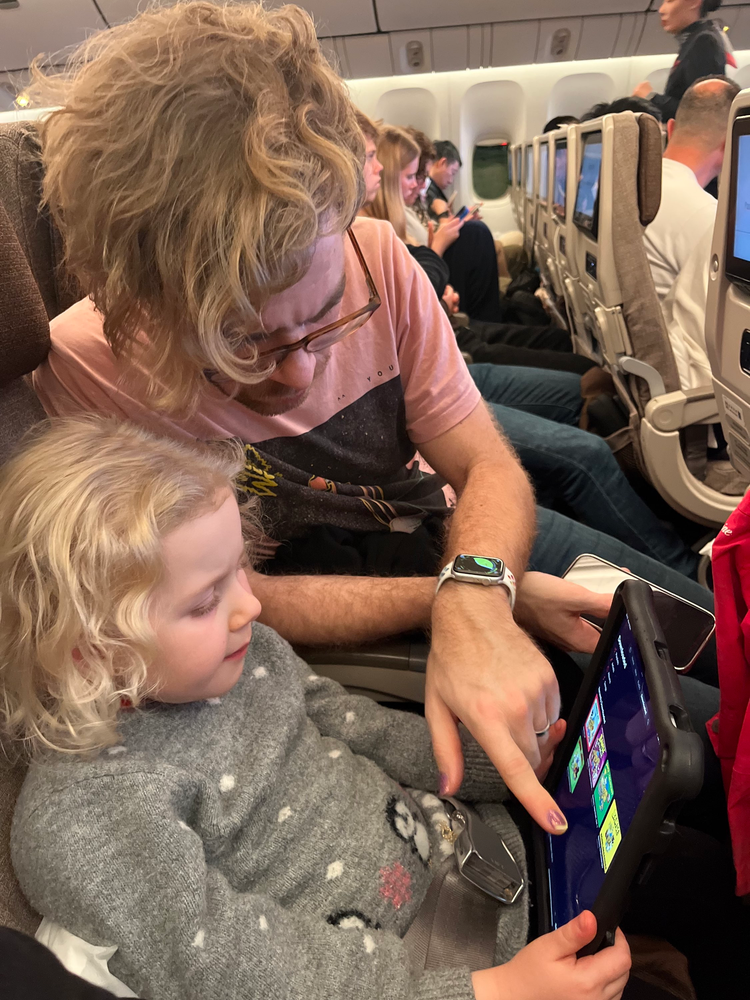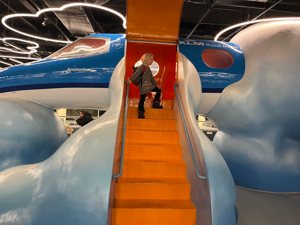 Här fick jag vara pilot och åka rutschkana innan vi borstade tänderna och stod i den längsta flygkön hittills.